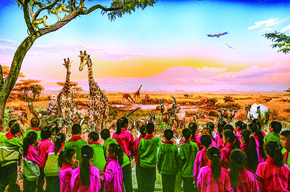 4月22日,鄂尔多斯市康巴什区实验小学学生在研学课程中观看有关非洲的全景电影。新华社发(王正摄)