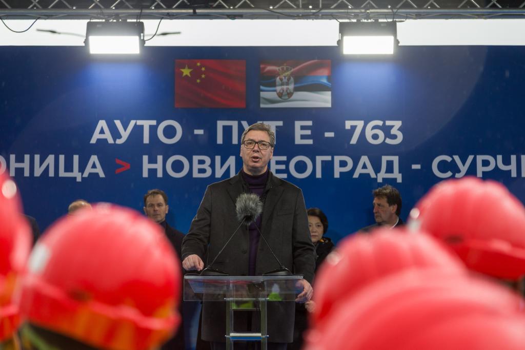 2023年4月1日,塞尔维亚总统武契奇在首都贝尔格莱德的塞尔维亚E763高速公路新贝尔格莱德-苏尔钦段通车仪式上致辞。新华社记者石中玉摄
