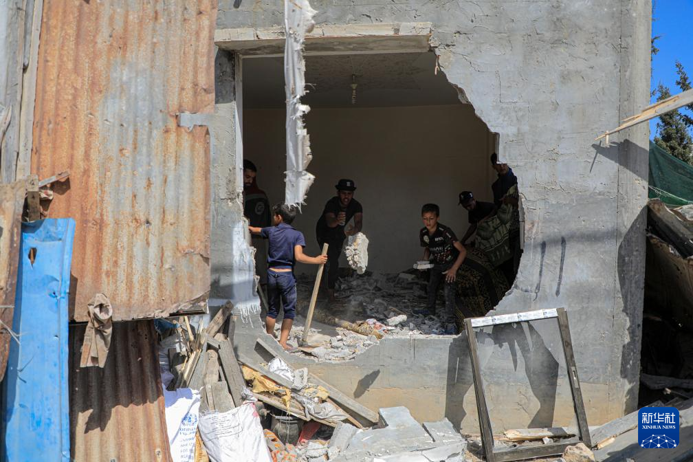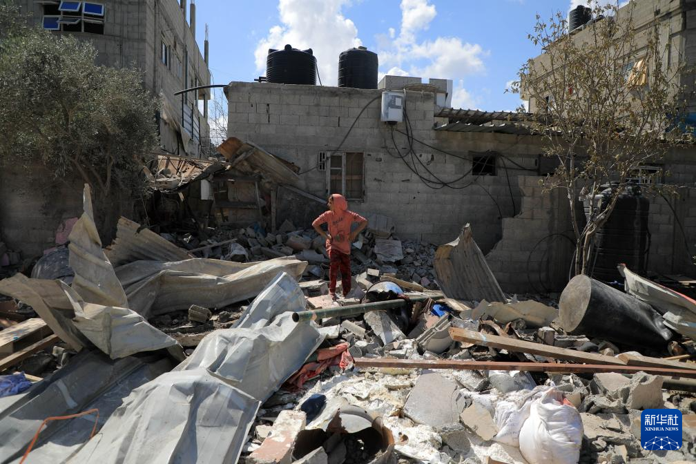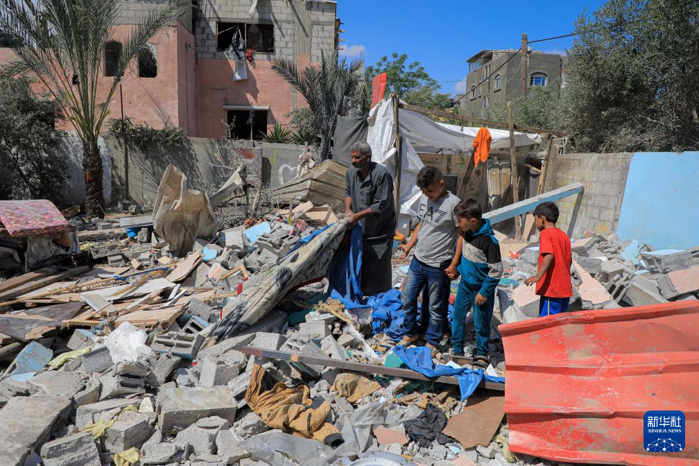 5月7日,在加沙地带南部城市拉法,居民查看以军轰炸后的废墟。 新华社发(里泽克·阿卜杜勒贾瓦德摄)