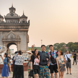 5月1日,中国游客在老挝首都万象著名地标景点凯旋门前拍照。新华社发(凯乔摄)