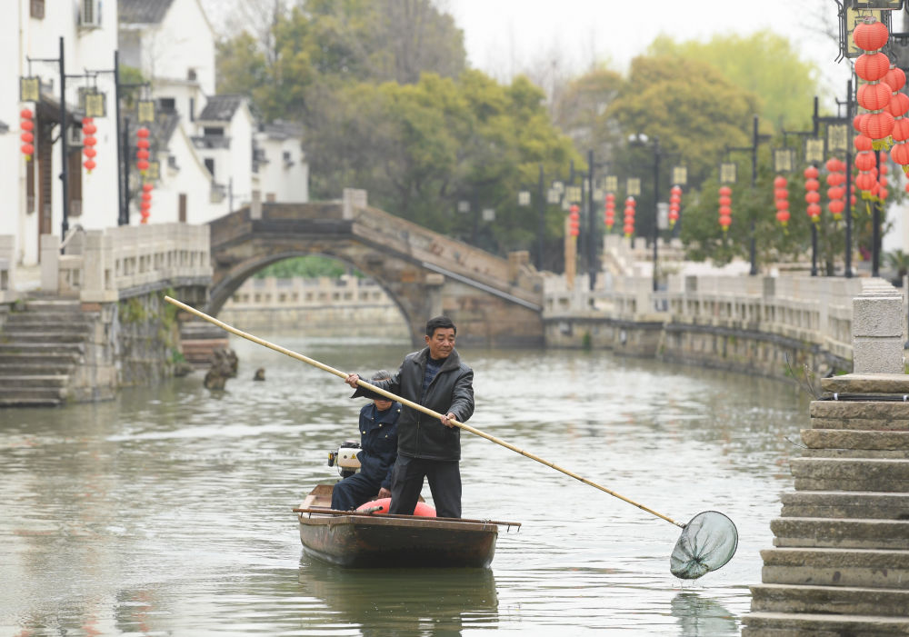 2023年3月16日,在太湖畔的浙江省湖州市织里镇义皋村,保洁员在清理河道。多年来的溇港整治使得太湖周边河道水质明显改善,也为乡村旅游注入动力。新华社记者 翁忻旸 摄