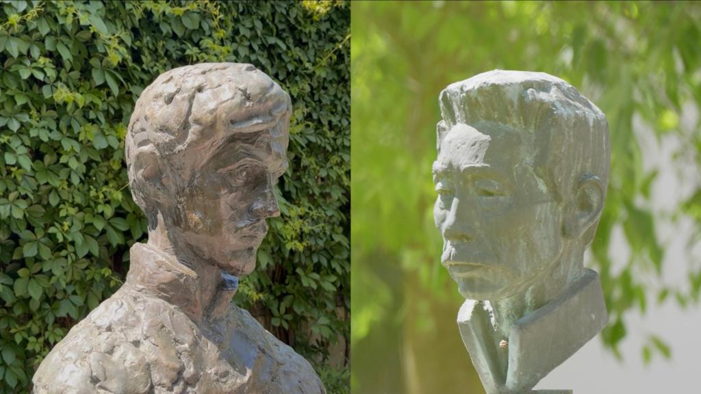 北京鲁迅博物馆内的裴多菲雕像(左)和匈牙利裴多菲故居内的鲁迅雕像(右)。