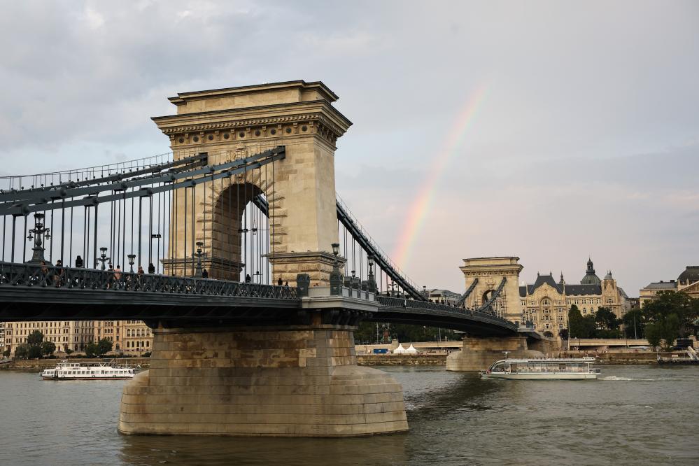 彩虹挂在匈牙利布达佩斯链子桥后的天空。