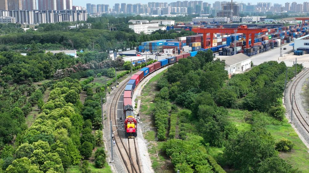 2022年7月29日,合肥至匈牙利布达佩斯的中欧班列从合肥北站物流基地驶出(无人机照片)。