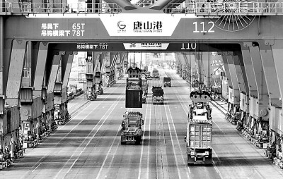 河北唐山港积极打造国际物流港。图为工人在京唐港区集装箱码头操作吊装设备。新华社发