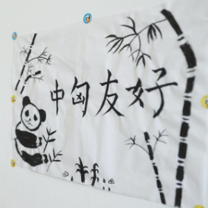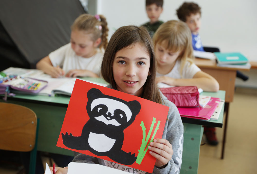 匈中双语学校三年级学生宝怡展示自己的大熊猫形象美术作品(2024年5月3日摄)。