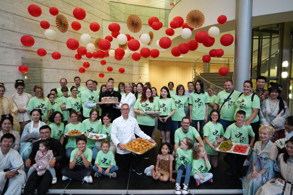 2023年9月3日,人们在匈牙利德布勒森市克尔切伊文化中心参加“第四届匈牙利月饼制作坊”活动并合影。在此次活动上,500多名当地市民齐聚一堂,制作中秋月饼,体验中国传统文化。