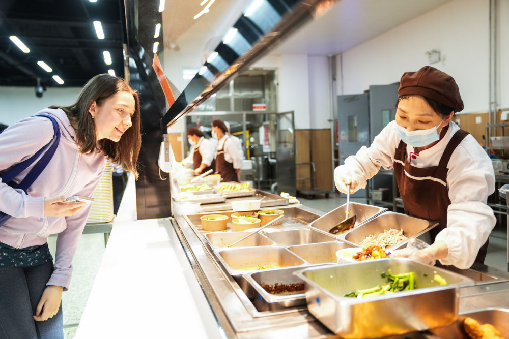 胡灵月在北京首都师范大学的食堂内打饭(2024年4月28日摄)。
