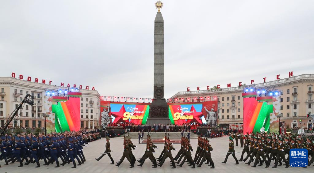5月9日,白俄罗斯仪仗队在明斯克胜利广场接受检阅。新华社发(任科夫 摄)