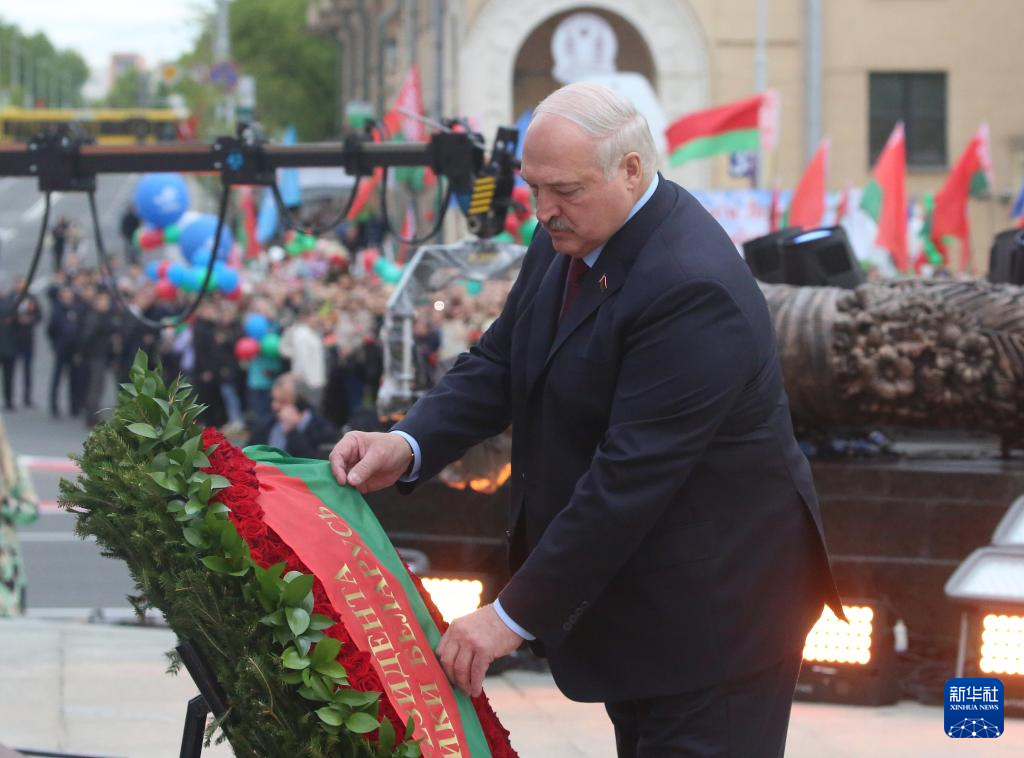 5月9日,白俄罗斯总统卢卡申科在明斯克胜利广场献花。新华社发(任科夫 摄)