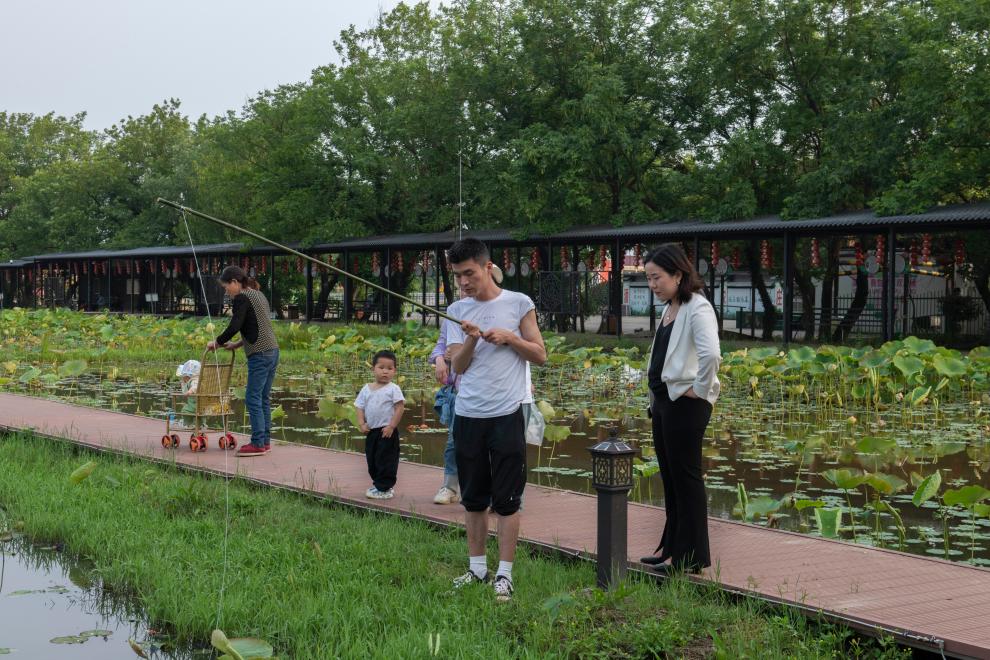 立夏时节,潜山市梅城镇潘铺村“悦荷居度假庄园”内,碧波微漾,荷叶青青。三五成群的游客正围坐在池塘边,手持竹竿体验小龙虾垂钓。