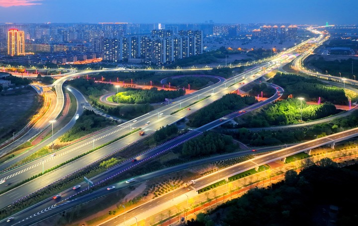 5月6日,傍晚时分霓虹灯点亮复兴大街裕华路立交桥(无人机照片)。(受访单位供图)