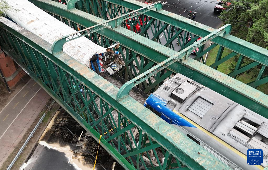 这是5月10日在阿根廷首都布宜诺斯艾利斯拍摄的火车相撞事故现场(无人机照片)。新华社发(马丁·萨巴拉摄)