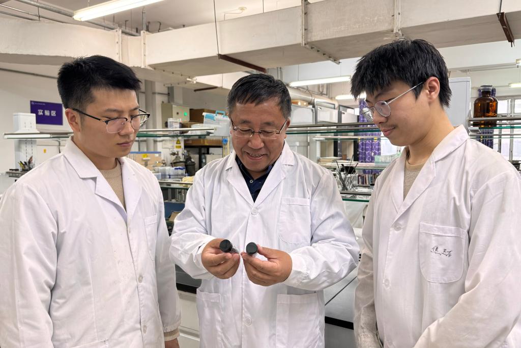 哈尔滨工业大学教授袁国辉(中)为学生讲解石墨材料。新华社记者杨思琪 摄
