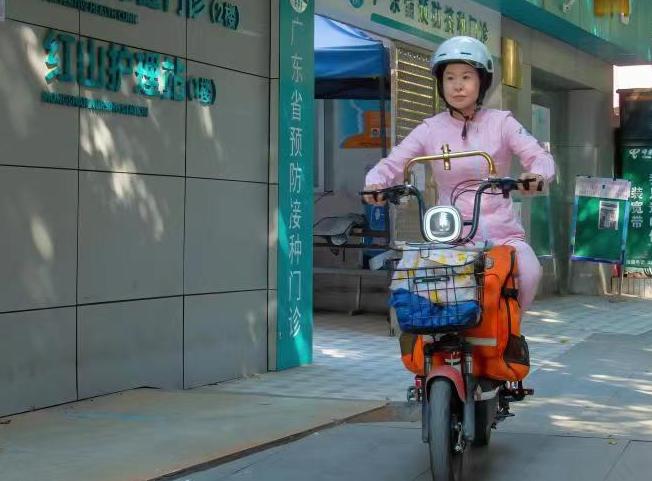 广州市黄埔区红山街社区卫生服务中心家庭病床科负责人罗岚上门开展居家护理途中。新华社发