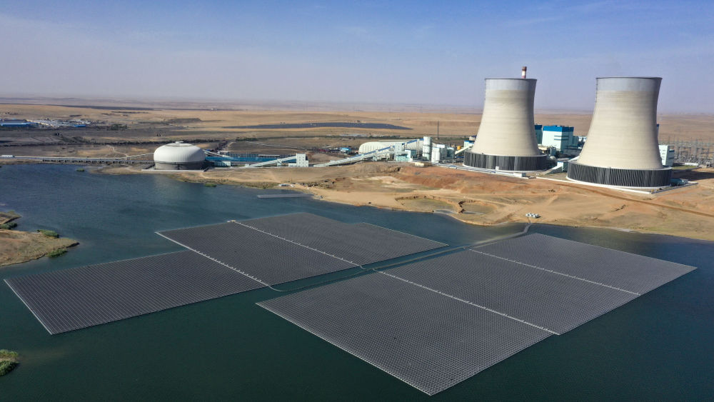 国家能源集团宁夏电力公司宁东电厂3×5.98兆瓦漂浮分布式光伏发电项目全景(无人机照片,2022年6月17日摄)。新华社记者 王鹏 摄
