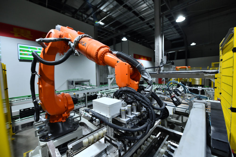 在广西柳州市一家新能源汽车电池生产企业,机器人在生产线上作业(2023年5月10日摄)。新华社记者 黄孝邦 摄