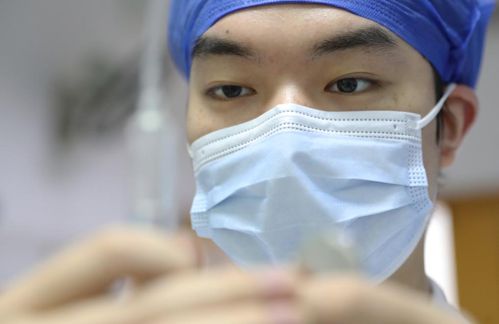 ↑2024年5月9日,湖南省衡阳市南华大学附属第一医院乳腺淋巴瘤病区,周遥在调整输液速率。CICPHOTO/曹正平 摄