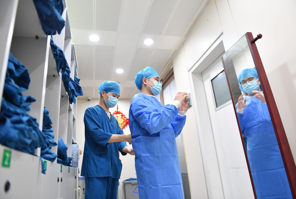 5月9日,中南大学湘雅三医院重症监护室男护士郑昊义协助欧阳云峰穿隔离衣。 新华社记者 赵众志 摄