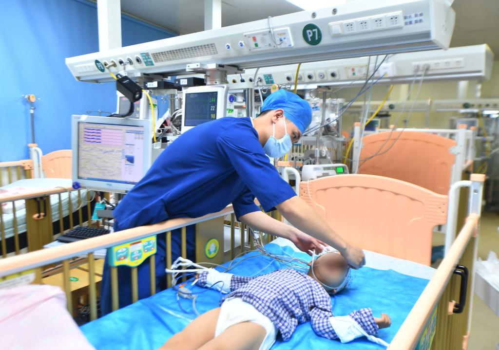 5月9日,中南大学湘雅三医院男护士刘颖哲在护理患儿。 新华社记者 赵众志 摄