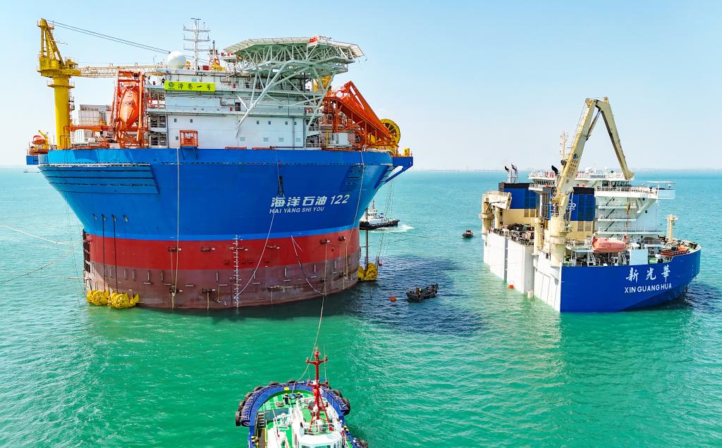↑2024年5月12日,“海葵一号”在山东港口青岛港锚地装船。(无人机照片)CICPHOTO/张进刚 摄