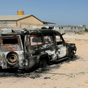 这是2023年8月16日在利比亚的黎波里拍摄的一辆在艾因扎拉区冲突中被烧毁的车辆。新华社发(哈姆扎·图尔基亚摄)