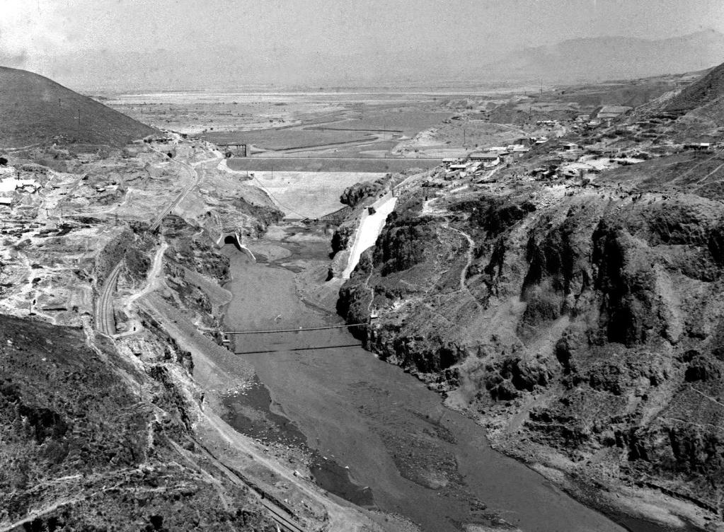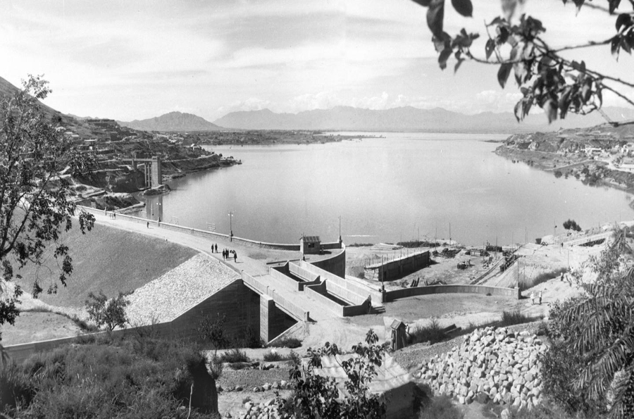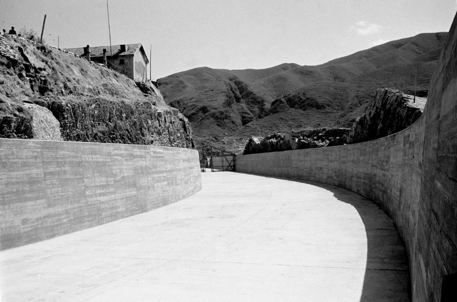 1953年,修筑官厅水库的工人们开动着羊角碾在大坝上施工作业。