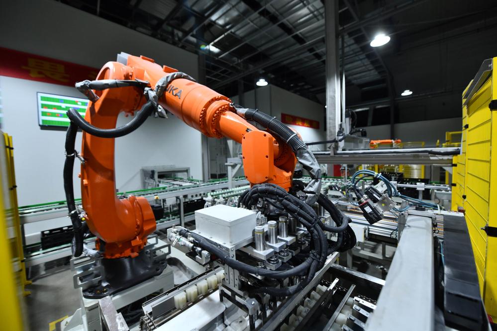 在广西柳州市一家新能源汽车电池生产企业,机器人在生产线上作业(2023年5月10日摄)。新华社记者黄孝邦摄