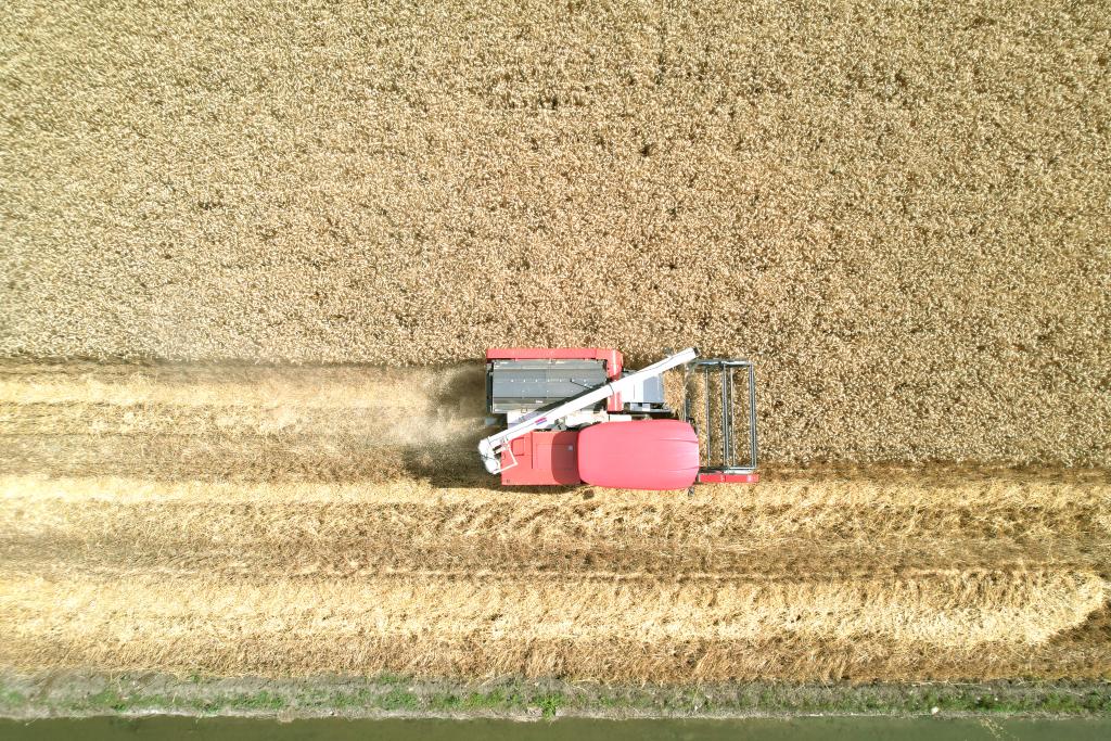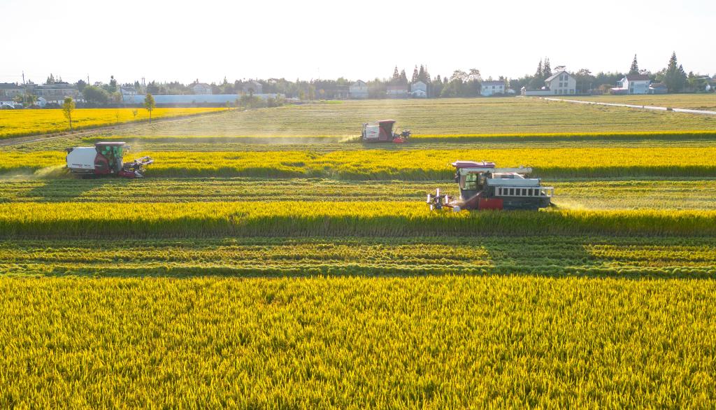 2023年10月29日,江苏省海安市孙庄街道营溪村农民驾驶收割机收割水稻(无人机照片)。新华社发(翟慧勇摄)