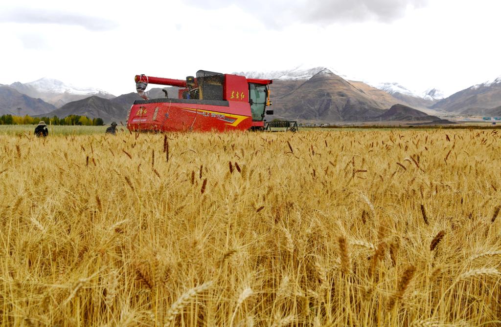 工作人员驾驶农业机械在西藏拉萨市林周县曲果强村的高标准农田里收获小麦(2023年10月12日摄)。新华社记者 张汝锋 摄