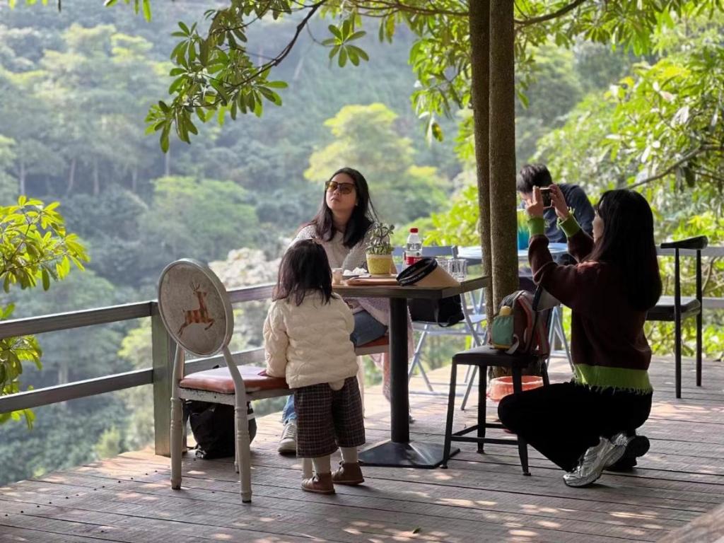 游客在天玉咖啡庄园露台卡座上品咖啡(5月4日摄)。(刘晓东 摄)