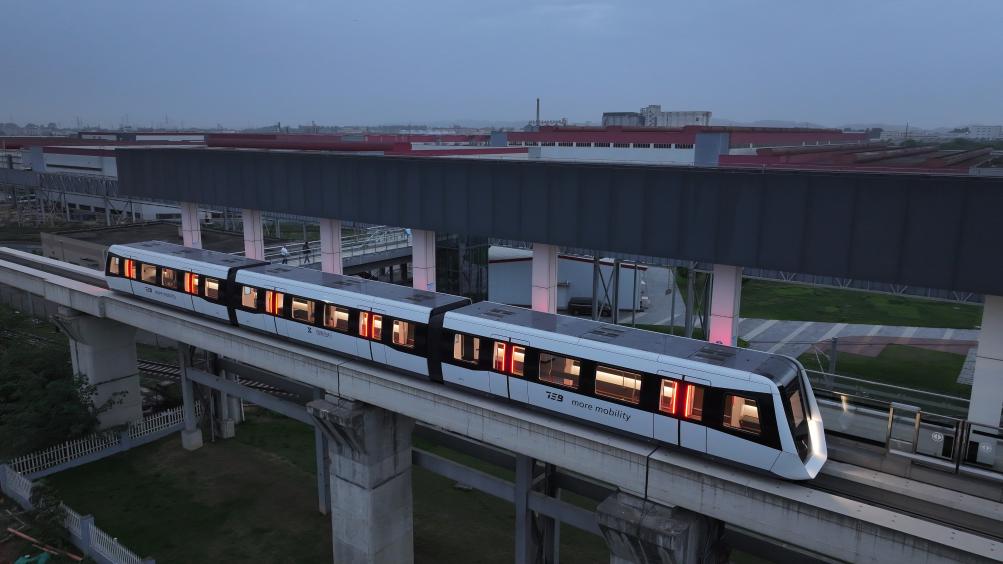一列三编组内嵌式中低速磁浮列车在位于四川成都的磁浮示范线上测试运行。(受访者供图)