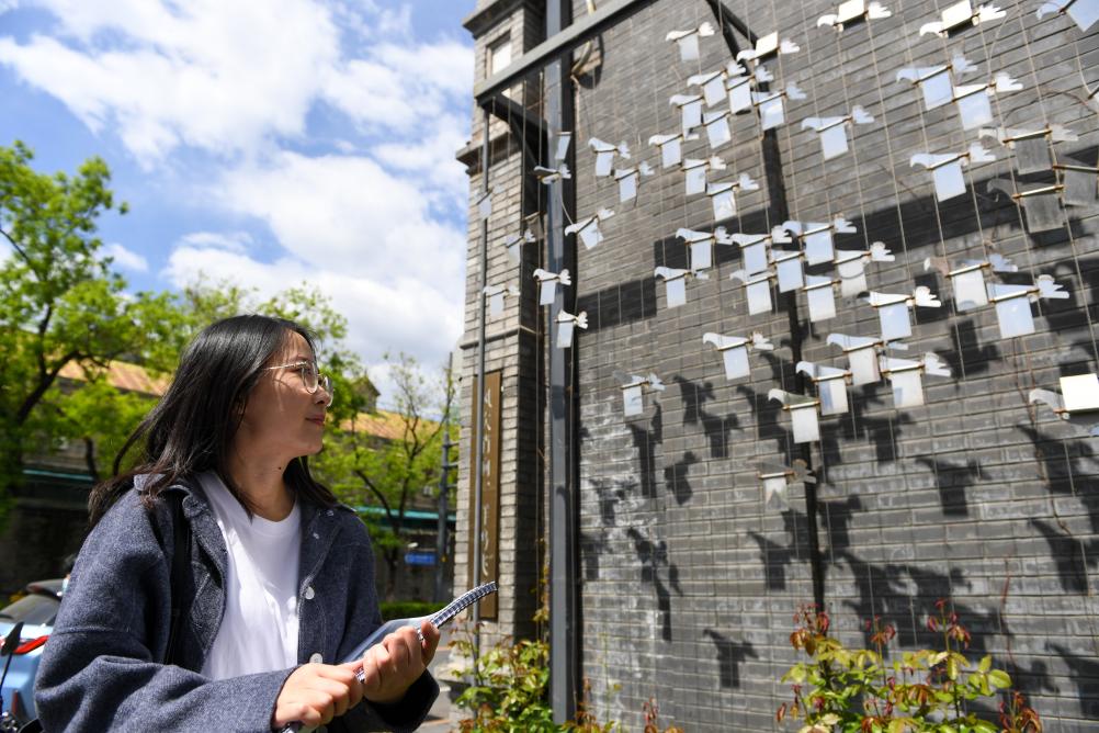 在东四北大街,中国城市规划设计研究院高级工程师、崇雍大街整治提升工程的建筑专业负责人孙书同站在新设置的一处展现老北京鸽哨的装置前(4月23日摄)。在更新改造中