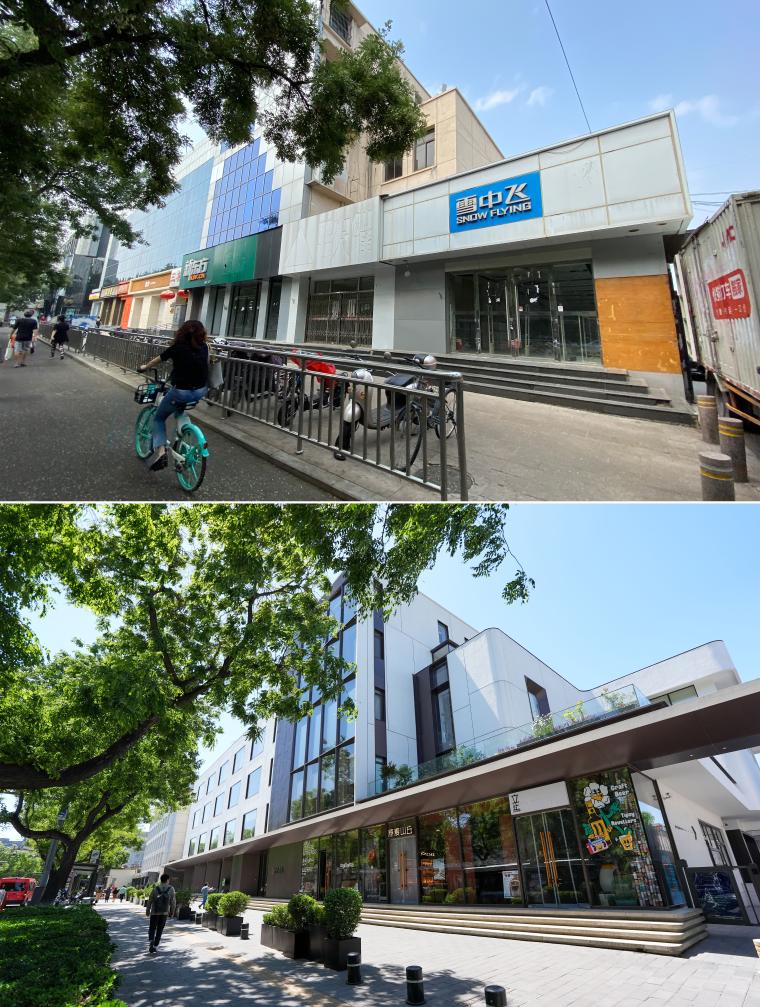 上图为位于东四南大街的原三友商场(资料照片);下图为2024年5月11日拍摄的由原三友商场改造而来的雪莲·亮点文创园外景。雪莲·亮点文创园已成为时尚生活打卡地和文化产业集合地。
