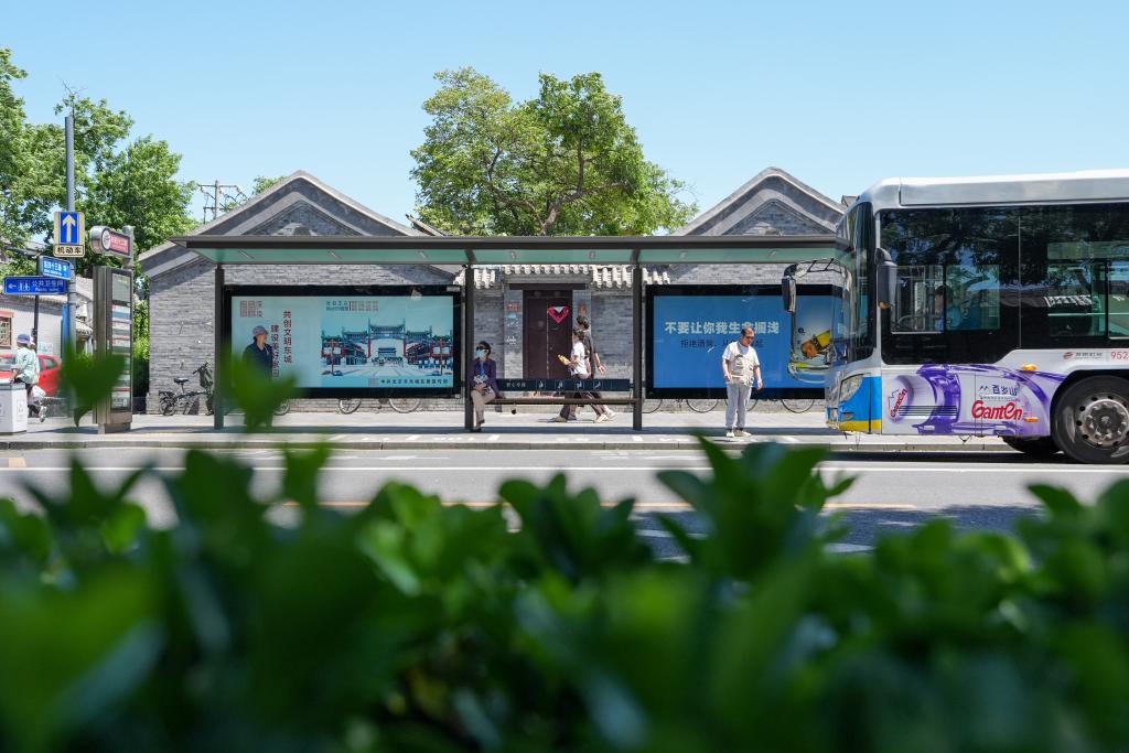 在东四北大街东四十二条公交车站,乘客在新设置的“港湾式”公交站等候公交车(5月11日摄)。推动“慢行优先”“健步悦骑”