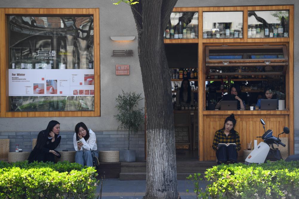 顾客在东四北大街117号一处咖啡店休闲(4月16日摄)。