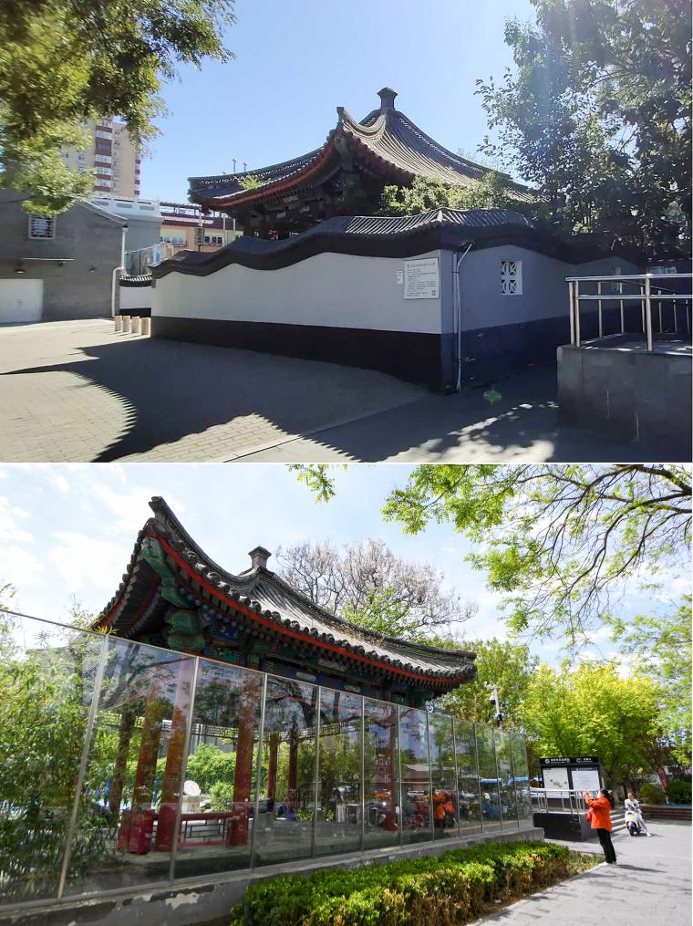 上图为北京市东城区东四九条小学围墙内的贝子奕谟府遗存——咏竹亭(资料照片);下图为2024年4月23日,一位行人参观咏竹亭,崇雍大街改造中将此处封闭围墙改造为透景围墙。