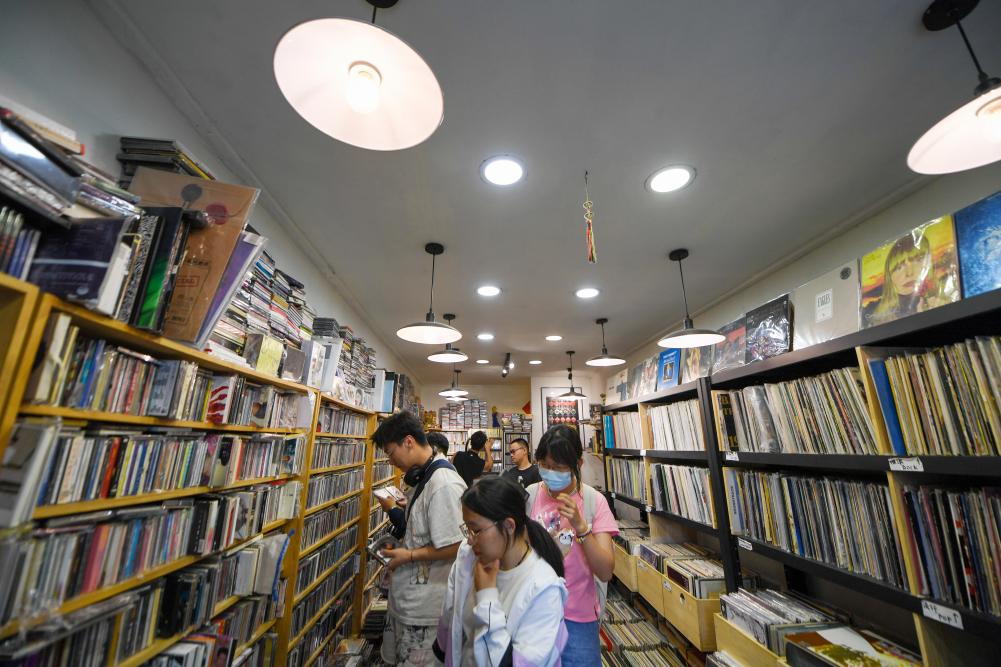 在东四北大街499号内的一处唱片店,顾客选购唱片(5月1日摄)。