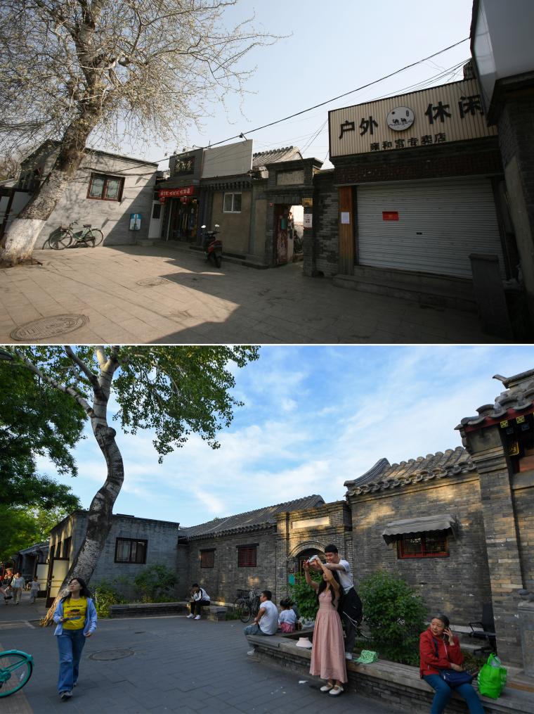 上图为2018年6月8日拍摄的雍和宫大街40号附近商铺和原有广告牌匾(资料照片);下图为2024年5月11日拍摄的改造后的雍和宫大街40号。自2018年开始,北京市东城区