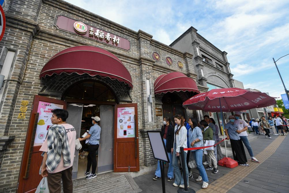 5月1日,游客在位于东四北大街152号的北京稻香村“零号店”外排队等候。2021年9月,北京稻香村“零号店”在东四北大街152号开张,售卖特色糕点和京味茶饮,成为集民俗、美食、文化于一体的传统食品文化体验馆。