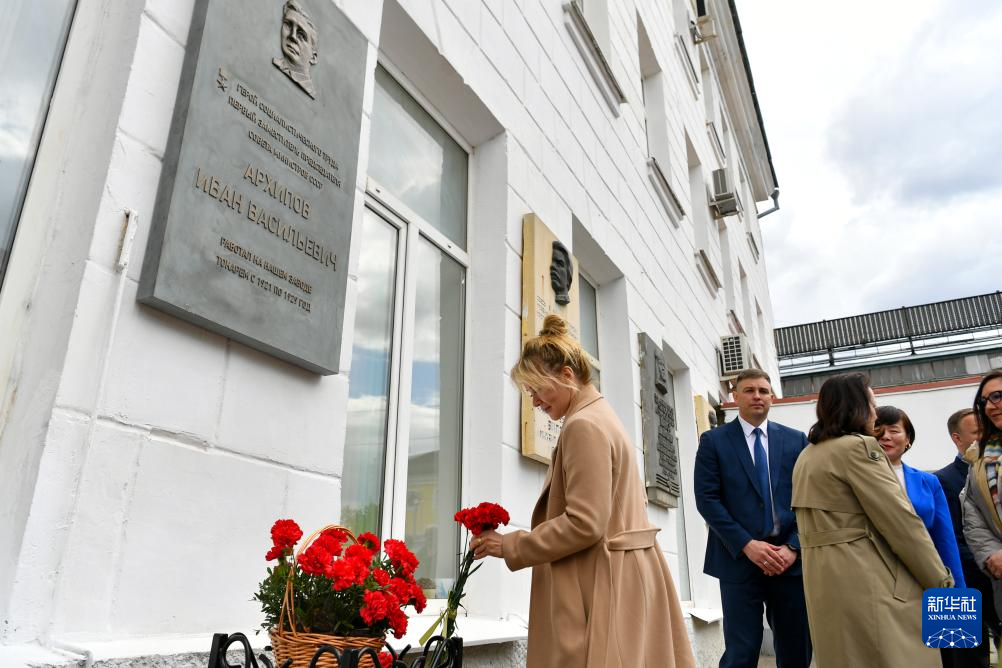 5月15日,在俄罗斯卡卢加州卡卢加市,人们向原苏联援华专家组总负责人伊万·瓦西里耶维奇·阿尔希波夫纪念牌献花。新华社记者 曹阳 摄