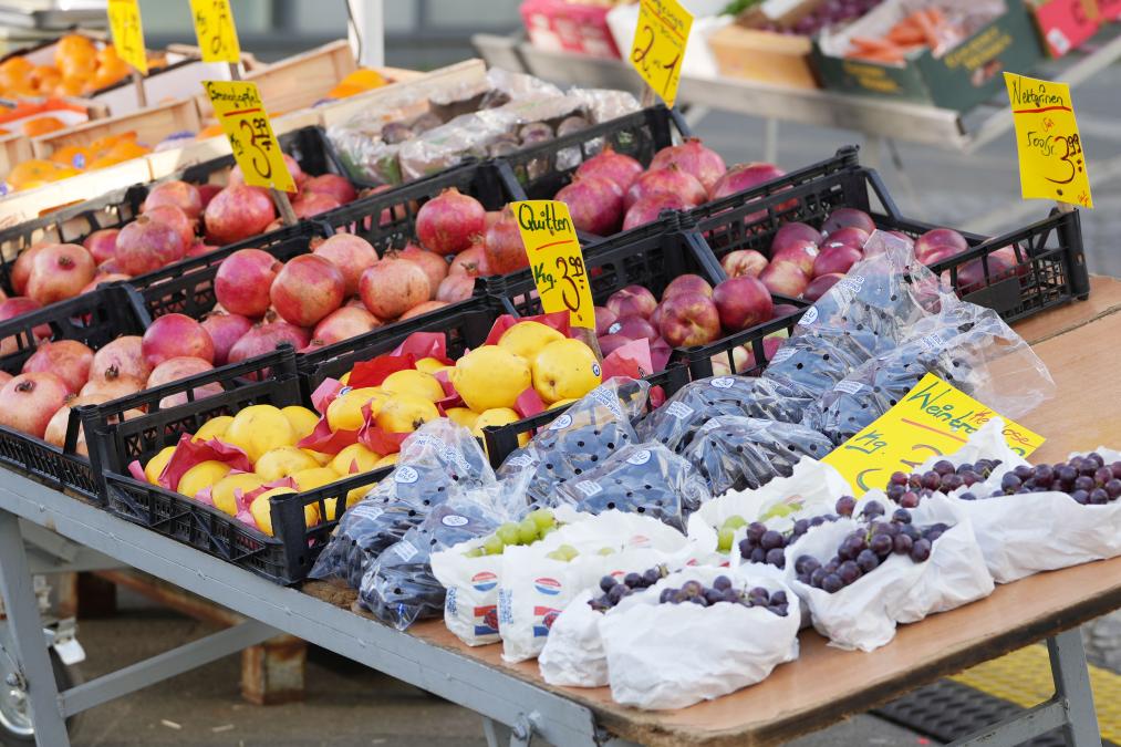 这是3月2日在德国柏林拍摄的一处水果摊。(新华社发,斯特凡·蔡茨摄)