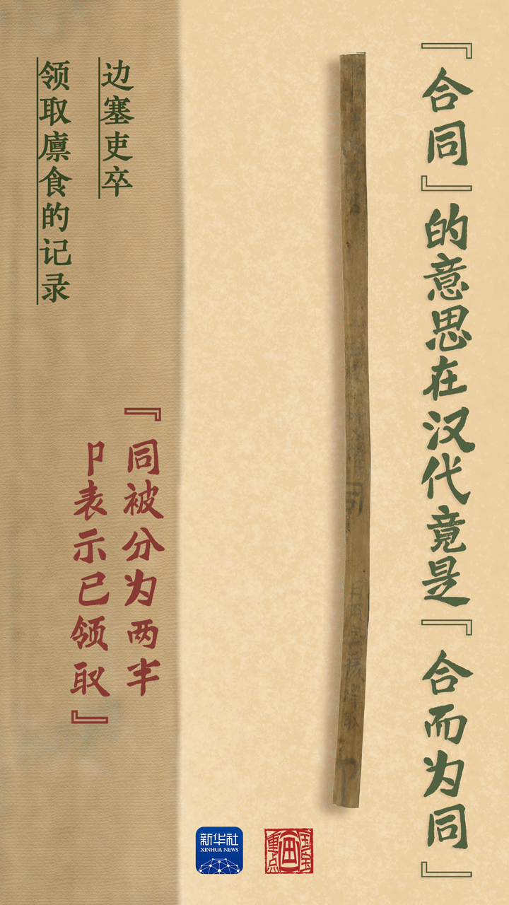 汉代人在简牍上书写一个“同”字,从中间一分为二,由双方当事人各执一半。需要核验时,双方将所执半简合在一起,这样就能拼成一个完整的“同”字。或许,这就是现代“合同”的来历。