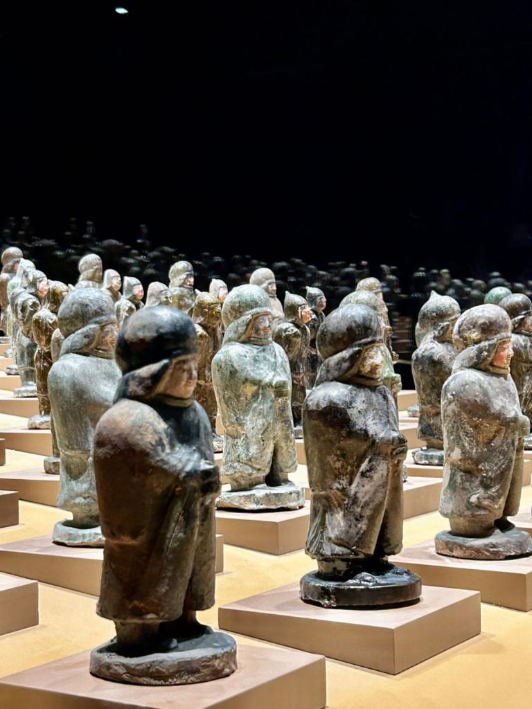 司马金龙墓中的出行俑阵立于展厅之中,前侧导骑俑着鸡冠帽窄袖衣,整装待发;中间步兵仪卫俑戴垂裙风帽,神情肃穆,簇拥两侧;后方甲骑具装俑,头戴兜鏊,人马披甲,威武雄壮,护卫后方,威风凛凛。