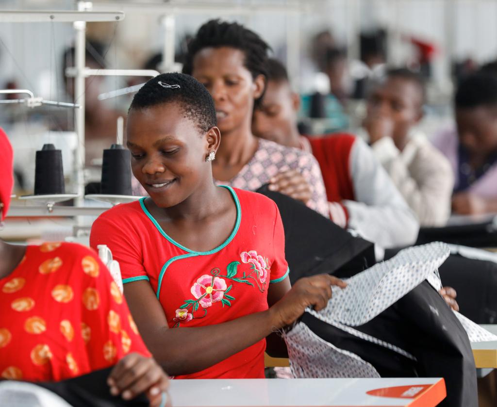 4月5日,在乌干达姆巴莱市中乌姆巴莱工业园,工人们在明珠科技有限公司的车间工作。新华社记者李亚辉摄