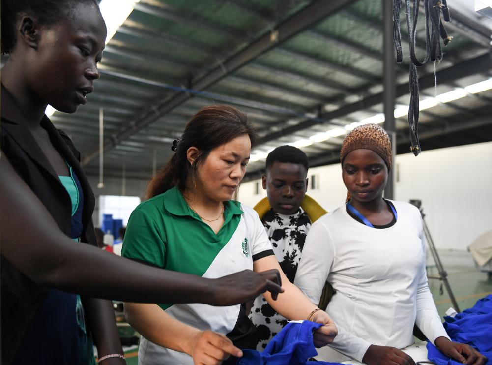 4月5日,在乌干达姆巴莱市中乌姆巴莱工业园的利达完美投资有限公司,一名中国技工为当地员工讲解缝纫技术。新华社记者李亚辉摄