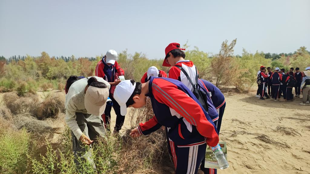 新疆策勒荒漠草地生态系统国家野外科学观测研究站,科研人员向公众讲解干旱区防风固沙植物骆驼刺种子培育实验。(中国科学院供图)