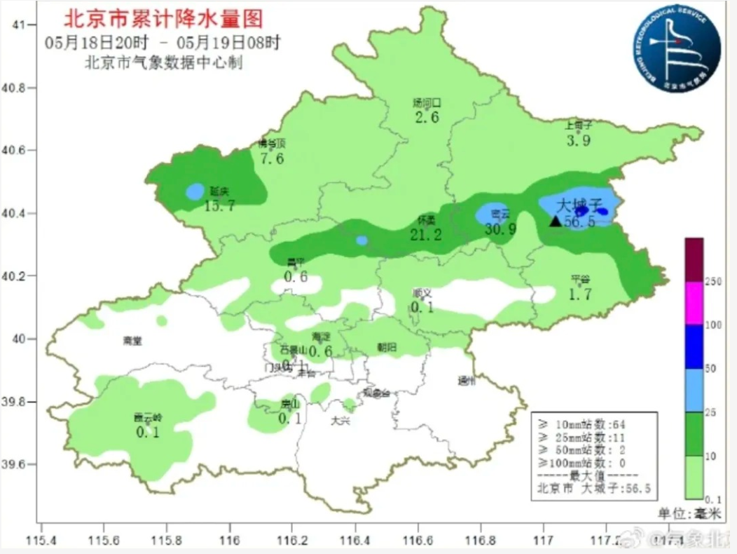 北京市气象台发布18日20时至19日8时降水量(毫米):全市平均3.0,城区平均(朝,海,丰,石,东,西)0.3;东北(密,顺,平,怀)7.1,西北(延,昌)6.9,西南(门,房)0.1,东南(通,大)微量;城区最大朝阳四元桥3.0,全市最大密云大城子56.5,最大小时降水强度密云冶仙塔45.2毫米/小时(19日4时至5时)。