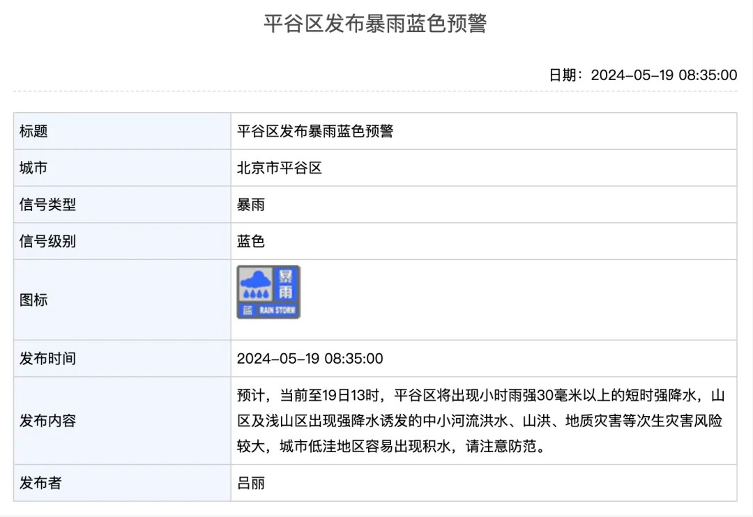 今天8时35分,平谷区发布暴雨蓝色预警:预计,当前至19日13时,平谷区将出现小时雨强30毫米以上的短时强降水,山区及浅山区出现强降水诱发的中小河流洪水、山洪、地质灾害等次生灾害风险较大,城市低洼地区容易出现积水,请注意防范。