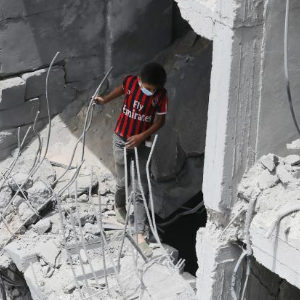 5月19日,在加沙地带中部努赛赖特难民营,一名巴勒斯坦男孩站在以军空袭后的废墟上。新华社发(巴勒斯坦通讯社供图)